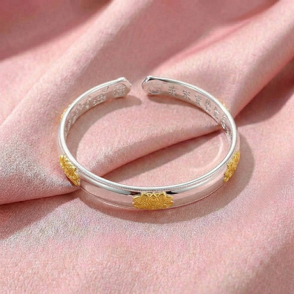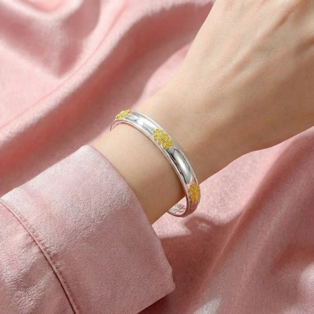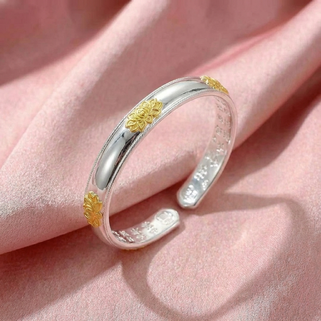 Vòng Tay Bạc Hoa Sen Vàng - Vòng Đặc Bạc Nguyên Chất - VTBHSV0010
