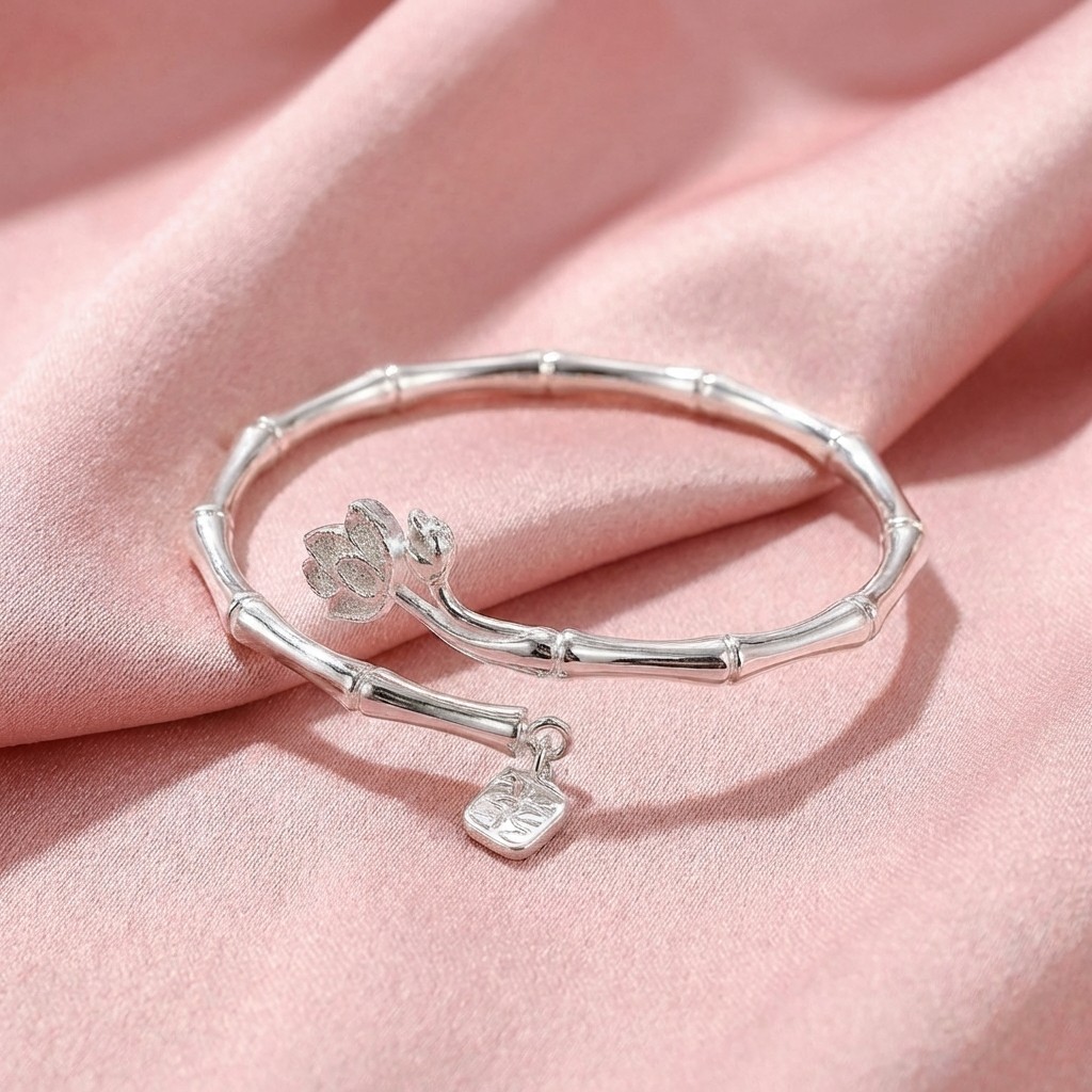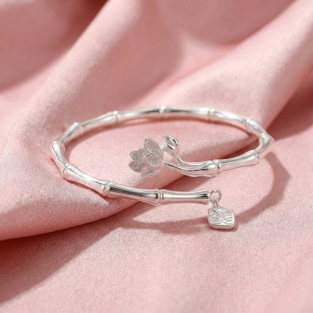 Vòng Tay Bạc Kiềng Trúc Hở Hoa Sen - Vòng Đặc Bạc Nguyên Chất - VTBKTHHS0030